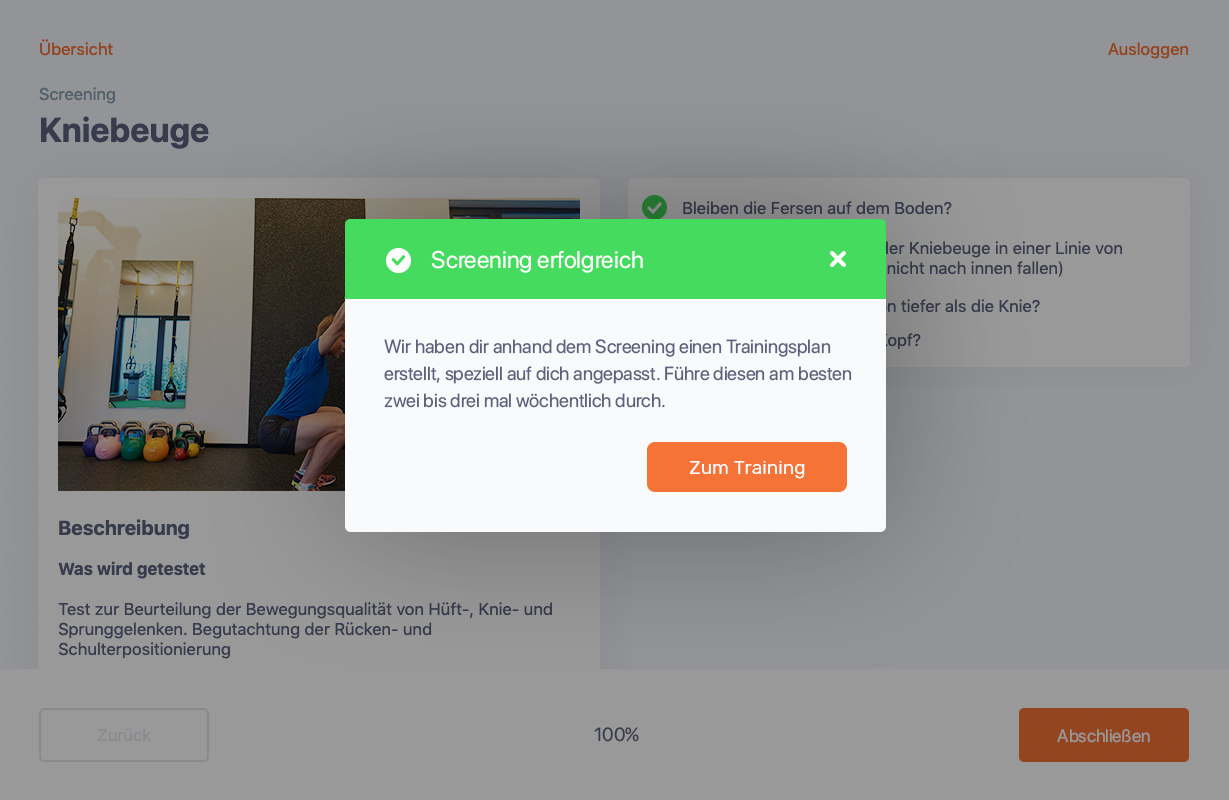 Hast du das Screening erfolgreich durchgeführt, bekommst du einen individuellen und auf deine Bedürfnisse angepassten Trainingsplan erstellt. Diesen kannst du dir im nächsten Schritt ansehen.