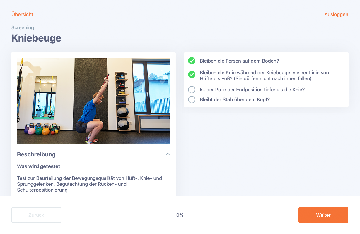 Starte das Screening und führe die vorgegebene Übung durch. Du bekommst Videos, Bilder und eine Beschreibung für die Druchführung. Auf der rechten Seite kannst du dann zutreffendes abhaken und anschließend zur nächsten Übung gehen.