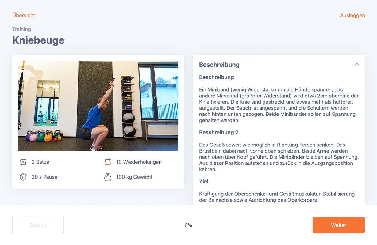 Wenn du das Training gestartet hast, bekommst du Videos, Bilder und eine Beschreibung für die Druchführung. Zusätzlich noch alle weiteren Informationen zu den Wiederholungen usw. Führe alle Übungen durch.