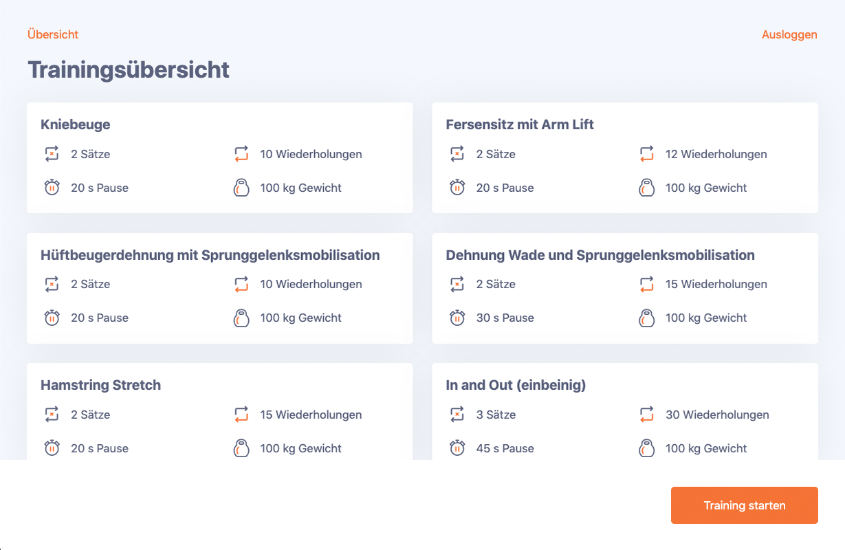 In diesem Schritt kannst du deinen Trainingsplan sehen. Zu jeder Übung findest du die Anzahl der Sätze, den Wiederholungen, der Pause und wenn benötigt auch noch das einzusetzende Gewicht.